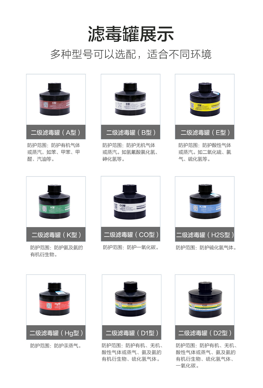 防護(hù)范圍:主要防護(hù)有機(jī)、無機(jī)、酸性氣體或蒸汽、氨及氨的有機(jī)衍生物及硫化氫氣體