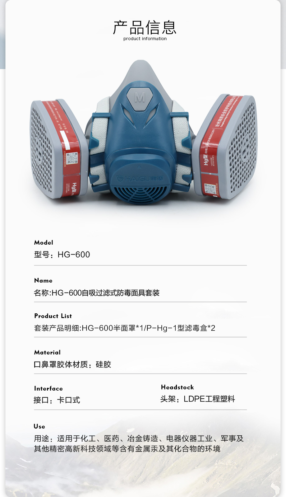 海固600半面罩+P-Hg-1濾毒盒 防護汞蒸汽套裝